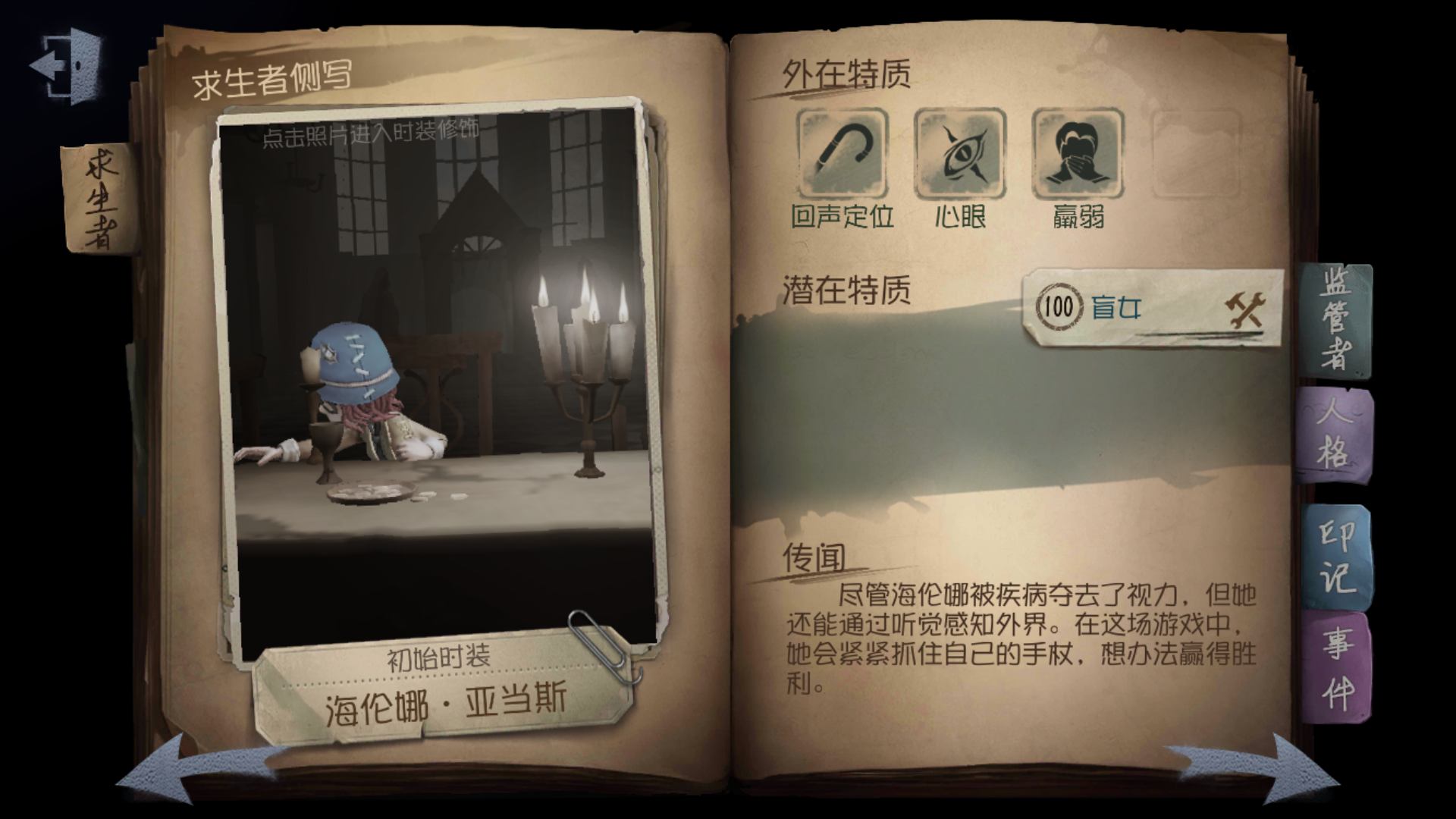 新角色盲女一出就立马用攒的钱买了下来。听很多“大佬”说盲女带寒意可以早发现监管者,然而。。。