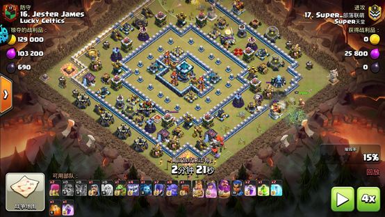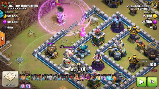 当超级炸弹人放在部落城堡的时候表现又如何呢?进攻主要配合战车来表现,而防守直接以超级炸弹人作为主要援兵使用。