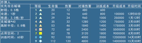 超级炸弹人的重要优势在于100%触发的自爆伤害,普通炸弹人被消灭后炸弹是不会炸的,但是超级炸弹人绝对会炸,被弹飞照样炸,而且伤害就是死亡自爆伤害。而这个伤害*40之后就是8520,10000,11520,即刚刚好炸开对应大本营等级的城墙,所以几个炸弹人才能解决的墙一个超级炸弹人就够了。