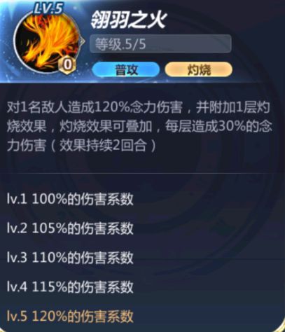 对1名敌人造成100%(105%/110%/115%/120%)的念力伤害。并附加1层灼烧效果,灼烧效果可叠加,每层造成30%的念力伤害(持续2回合)