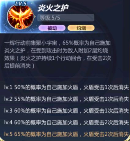 一辉行动前聚集小宇宙,50%(55%/60%/60%/65%)的概率为自己施加炎之护盾,在受到攻击时为敌人附加2层灼烧效果(炎之护盾持续一个行动回合,在受击1(1/1/2/2)次后提前消失)