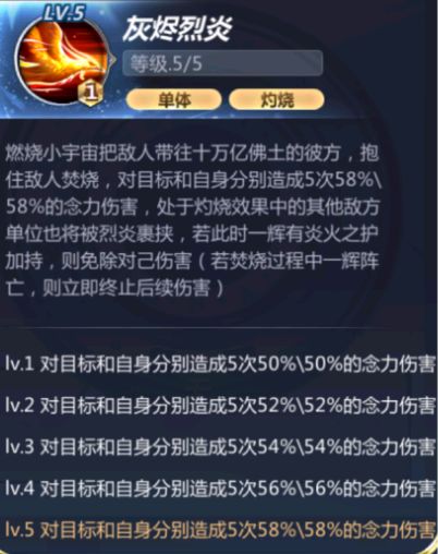 燃烧小宇宙把敌人带往十万亿佛土的彼方,抱住敌人焚烧,对目标和自身分别造成5次50%(52%/54%/56%/58%)的念力伤害。处于灼烧效果中的其他敌方单位也将被烈炎裹挟,若此时一辉有炎之护盾加持,则免除己方伤害(弱焚烧过程中一辉阵亡,则立即终止后续伤害)(多人组队时,仅能触发己方队伍添加的灼烧状态)