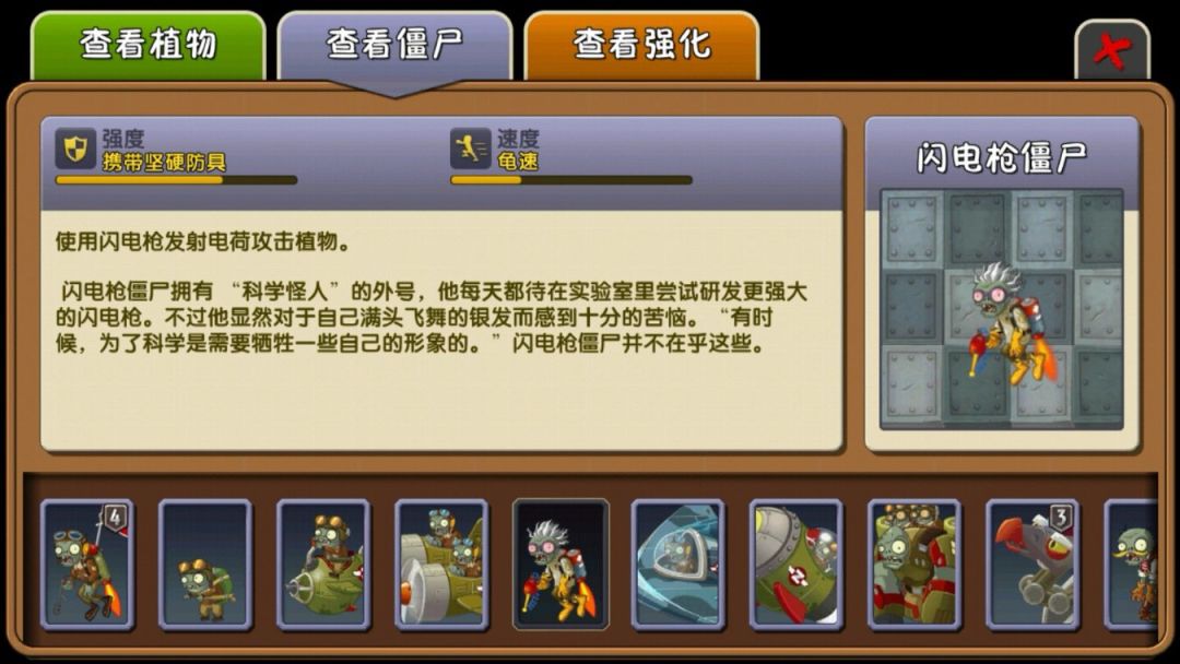 3.电枪僵尸。阵容中,前排植物要有橙色医药箱来抗电伤,并且要有电离红掌来吸收闪电来尽可能减少伤害。后期最好刷掉!