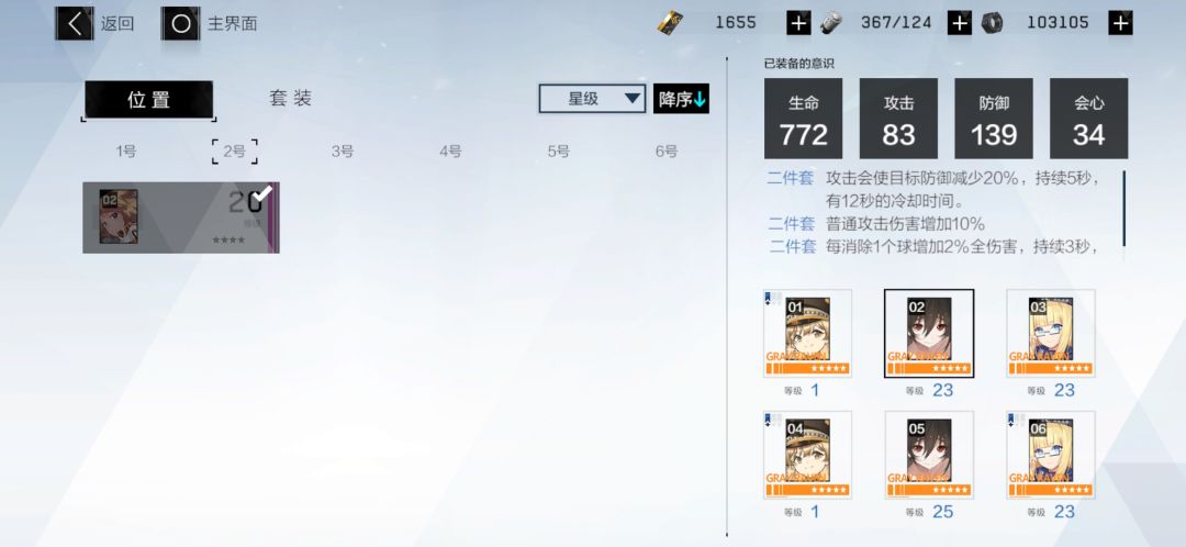 接下来给大家推荐一下意识搭配由于她强化攻击后是火属性元素伤害,这里建议意识搭配可以增强火属性伤害的或者可以加强普通攻击伤害的意识,但是这次测试估计没什么机会可以拿到什么6星意识什么的了。我这里给你们看一下我的吧我的这个重点是前期好获得都是些简单好获得的意识不用这么着刷就可以拿到。