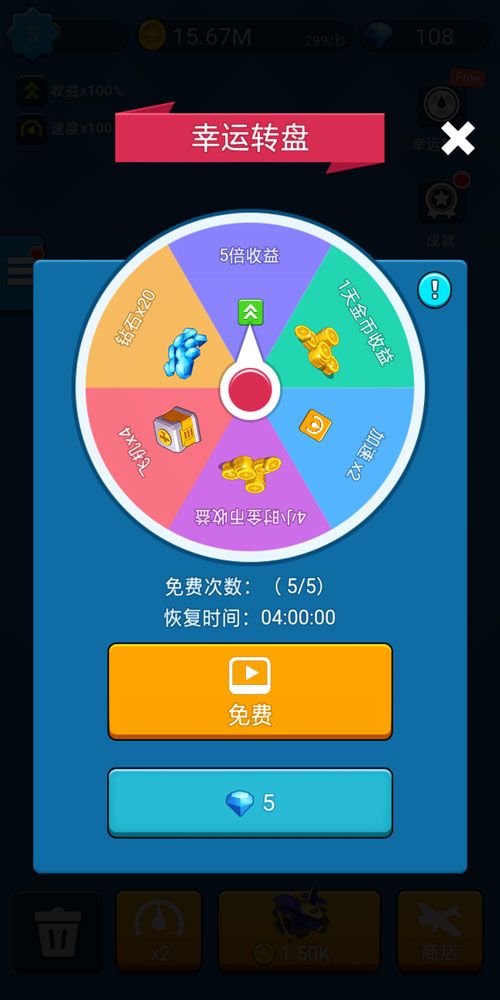 钻石不一定要献给女朋友,毕竟你可能是单身狗,但是可用于购买各类道具,从而在游戏中如虎添翼,实乃肥宅不二之选!例如时间道具可使你一举收获多日飞机收益;加速道具则将让你获得额外加速时间,体验加速收益的快感。此外,玩家还可使用钻石参与幸运转盘抽奖,飞机、金币、加速道具……正所谓富贵险中求,端的是紧张刺激!