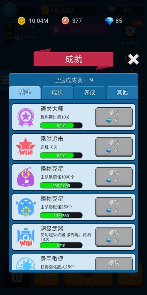 《不要打 飞机》成就系统分为“战斗”、“成长”、“养成”和“其他”四大板块,每一版块涵盖对应类型成就任务。