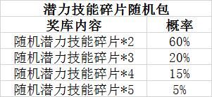 潜力技能碎片随机包*5:开启后可随机获得10~25个潜力技能碎片