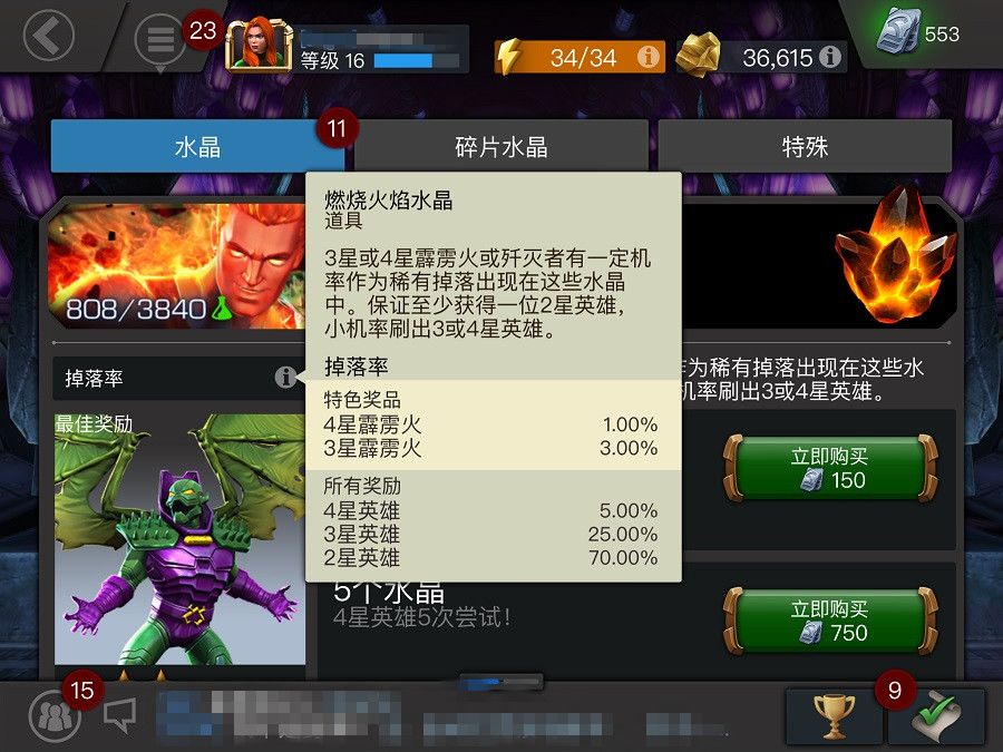 水晶抽奖是游戏中获得英雄最为基本的方式,在这方面《漫威:超级争霸战》最为良心的一点就是把各个水晶的出货概率都非常清楚地为大家标注了出来,在你抽取之前可以做到心中有底。