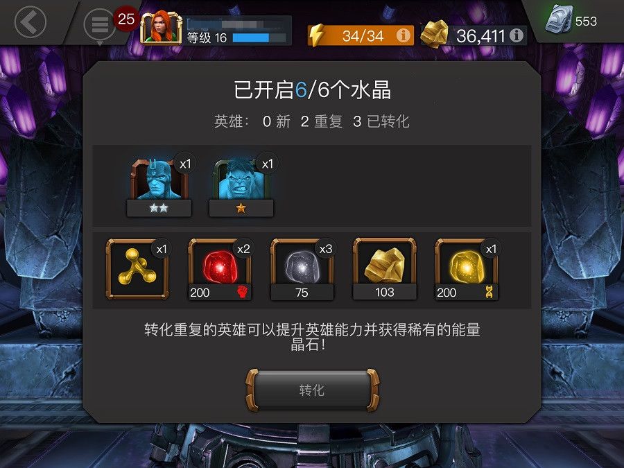 再一个就是每日水晶,每日水晶开出的一般都是一、二星的英雄和聚变因子,一二星的英雄在游戏中基本也只有收藏价值了,选择卖掉或者用于英雄能力的觉醒都是可以的(如果开到重复的英雄,在水晶抽取界面就可以点击转化按钮进行觉醒),每日水晶攒不攒都无所谓,基本也不会占用空间。