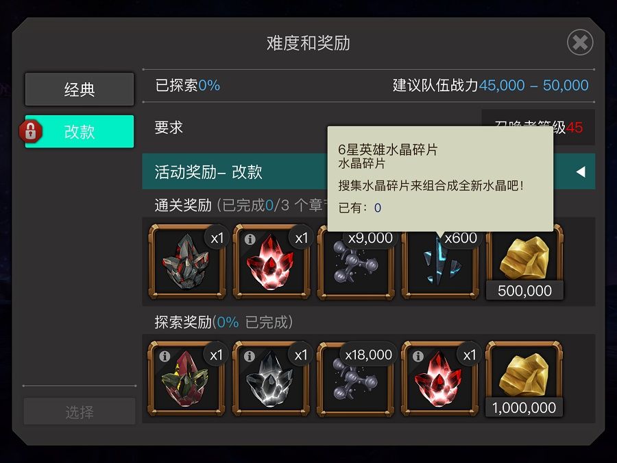 之后就是诸多碎片水晶的获取。碎片水晶种类很多,获得方式基本都是副本奖励(在副本中可以预览奖励),碎片水晶是获得五星及以上英雄的最常用渠道,新手和普通难度的副本会送高级英雄水晶的碎片,而在英雄、大师难度的副本则会送五星英雄水晶碎片。至于六星英雄水晶碎片,一般都是在“改款”难度的副本中,不过六星英雄在当前版本还不算主力,收集五星英雄才是游戏后期所必须的。此外,一些限时的充值礼包也会送高星英雄的水晶碎片。