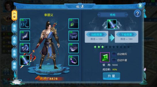 1、装备升星:消耗升星石及银两对装备进行升星,提升装备属性!