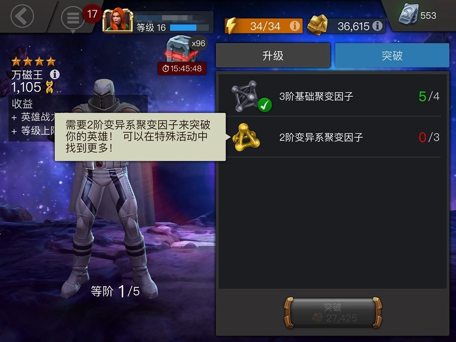 比如一个3星、等级为10的宇宙系英雄“终极钢铁侠”在10级进行第一次突破,需要消耗的是二阶基础聚变因子和一阶宇宙系聚变因子。而4星、等级为10的变异系英雄“万磁王”的突破则需要三阶基础聚变因子和二阶变异系聚变因子。