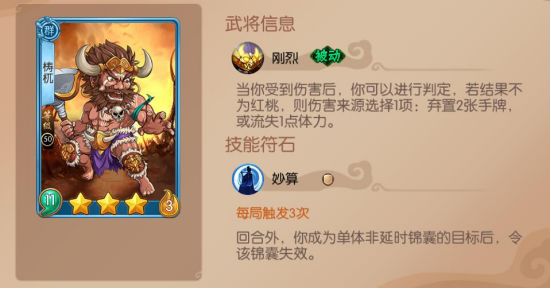 ②3星【援兵】:回合开始时,体力未满,失去1点怒气回复1点体力,可发动次数:4次