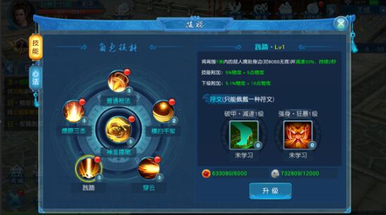 技能界面显示玩家技能,有职业区分,选择技能后显示技能等级,介绍及升级消耗