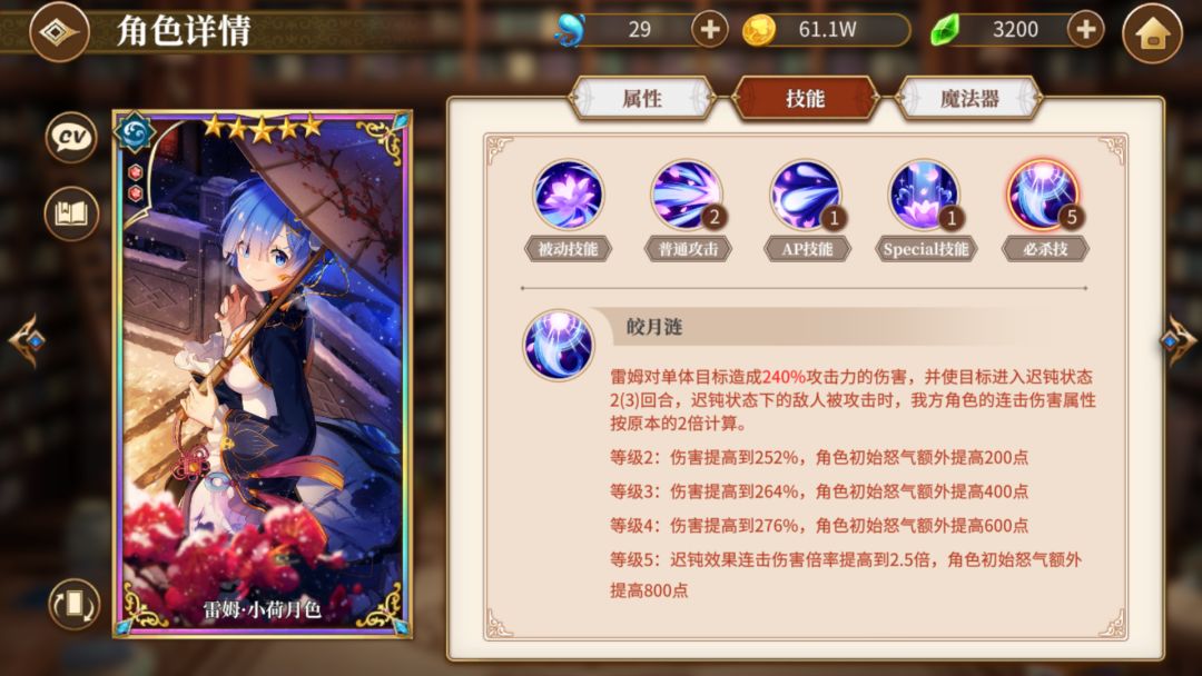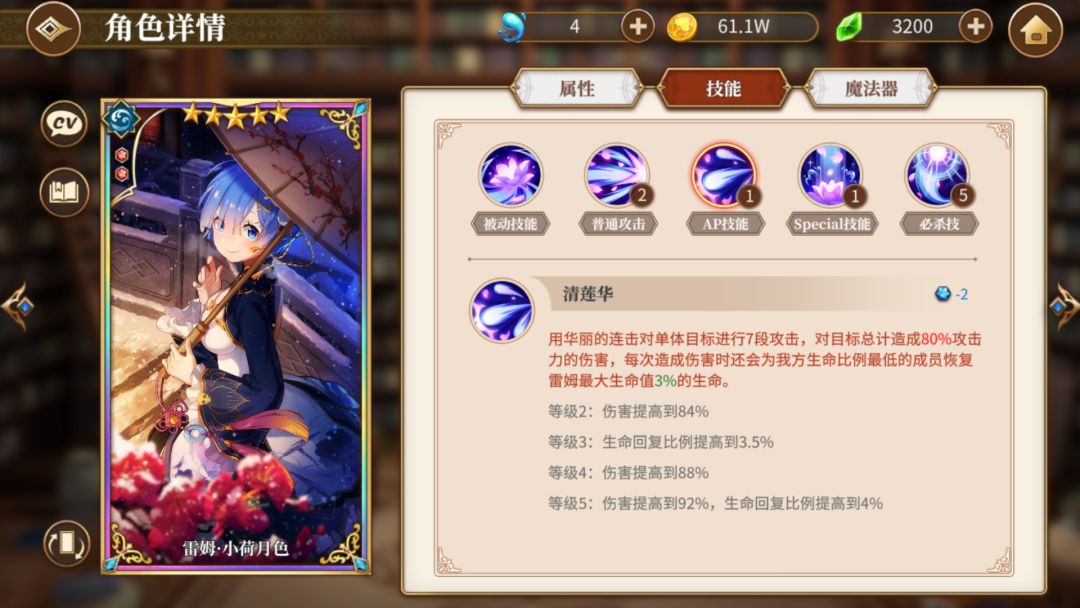 小荷雷姆被动技能自己挨打随机给己方一位成员增加5%连击持续三回合,最多叠加5层,虽然也比较契合自身sp技能这点当奖不错,但是sp技能 cd要4回合,而且经常出现奶不及时的情况就很鸡肋~如果己方成员有一个残血状态,当小荷雷姆放sp技能又会导致己方成员阵亡一名,这就血线低了奶不回!大招单体2倍连击伤害打很多副本都用不上,放技能也不给大招加怒气!ap技能基本用不上,辅助吃ap回复最低成员3%生命!这个花费两火更加不会用到了~
