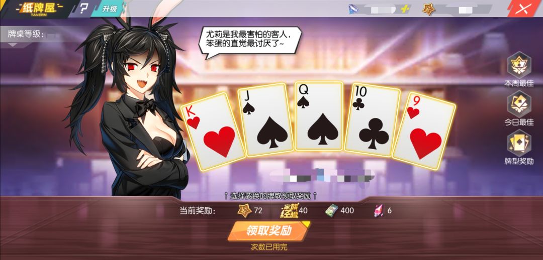 随机发牌之后,指挥官可以免费换牌,从而尽可能的得到最佳牌型,根据牌型不同会获得不同奖励,每周也会根据家族的最佳牌型给全员发放额外奖励呢~