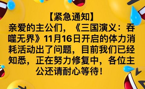 《三国演义:吞噬无界》11月16日开启的体力消耗活动出了问题,目前我们已经知悉,正在努力修复中,各位主公还请耐心等待!