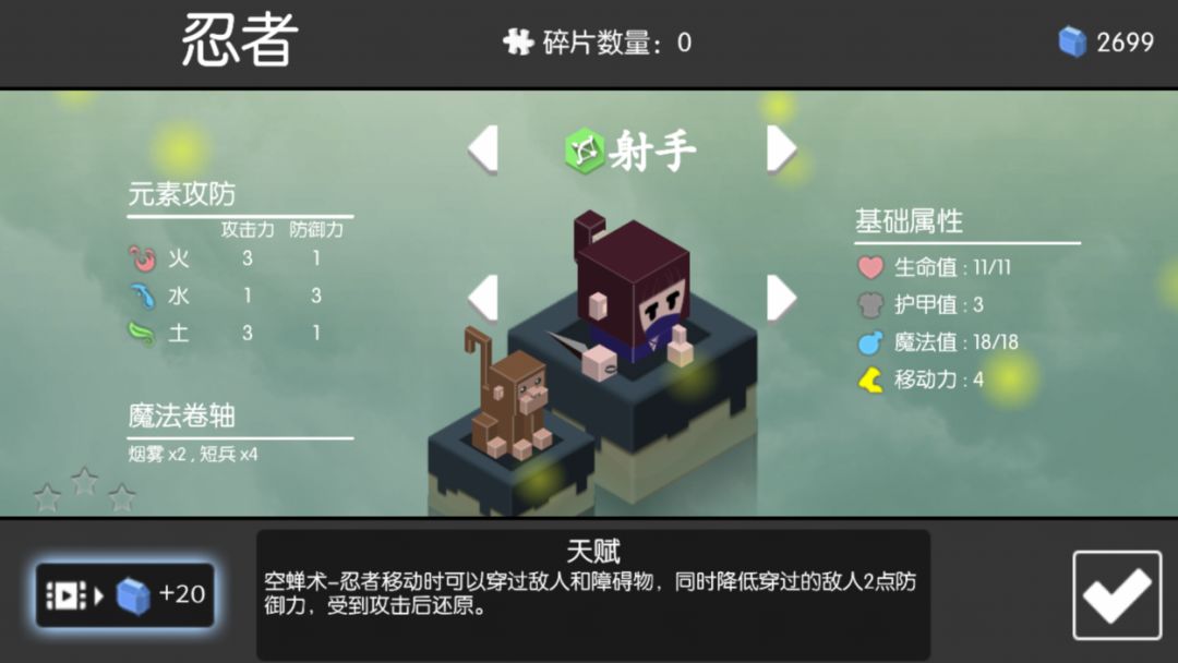 天赋:空蝉术-忍者移动时可以穿过敌人和障碍物,同时降低穿过的敌人2点防御力,受到攻击后还原。