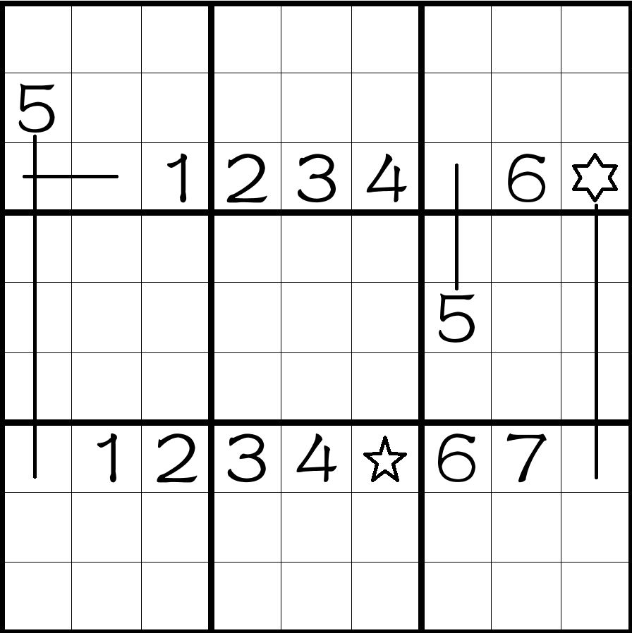 我们看第七行,第七行的数字5也只能存在于五角星格子内了。
