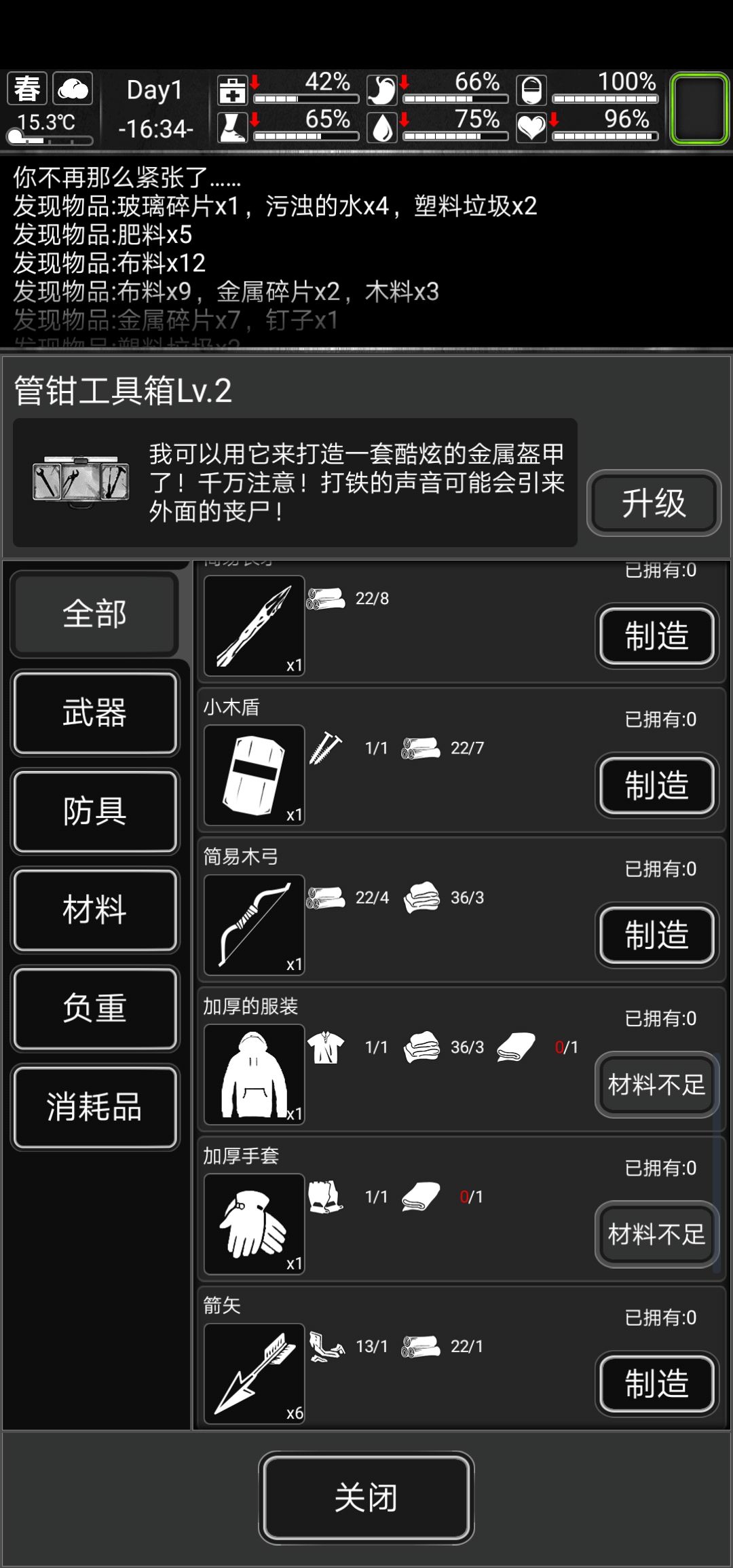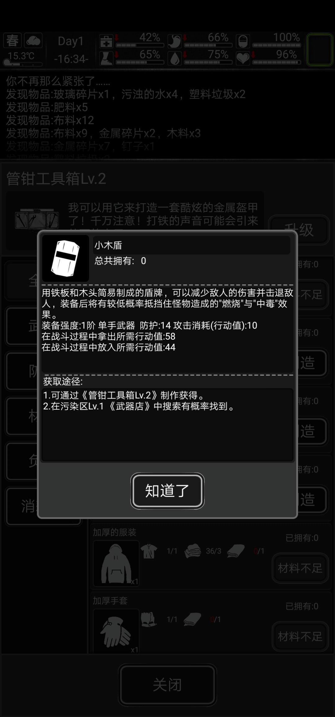去偷25木头20废铁3个废塑料把工作台升到2,盾牌做出来建议这样你就拥有了3+7+14=24点防护足够让你应对初期所有怪。(近战武器建议木制长矛)记得修一下锁。