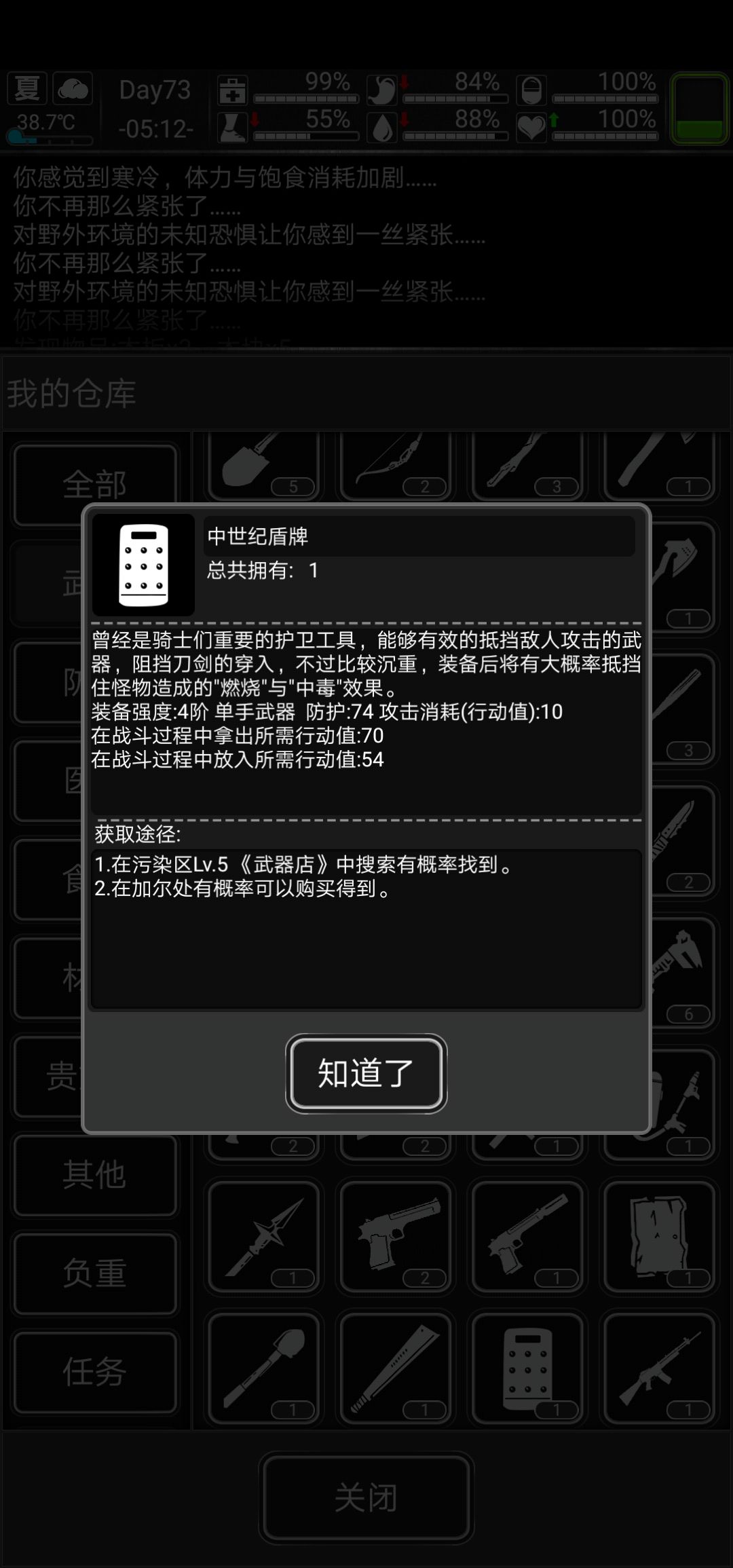 可以拿刷来的五血找胖子换医疗弹和杂物,找加尔换中世纪盾牌比废铁多40防防护来到120点,开始屯火药和步枪子弹(一个散弹可以拆两个火药有条件也可以屯一下)。