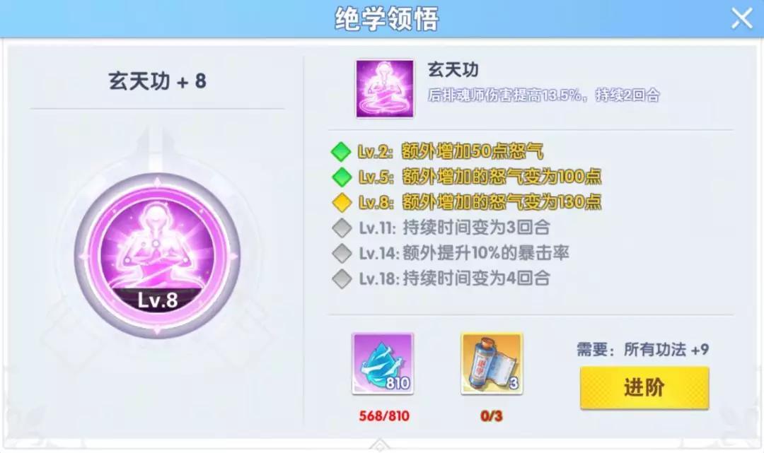 因为突破时所需的“玄真七阵”非常稀有,但又因为这个功法的效果过于强大,所以哪怕是用钻石购买“玄真七阵”也是可以考虑的。平民玩家应该是先以2级为小目标,5级为最终目标,8级则随缘即可