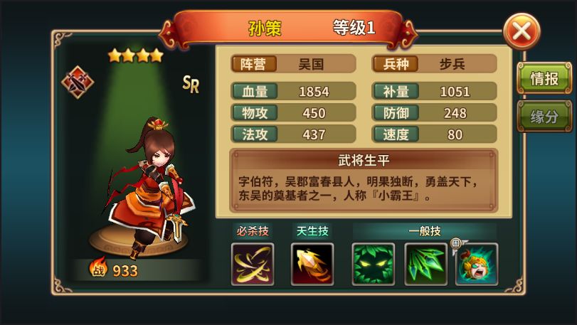 在三国演义中,“老罗”浓墨重彩的描写了一个白手起家的蜀汉,和一个挟天子以令诸侯的曹魏,但是对东吴的描写显得很少。除了孙权有一个“紫髯碧眼”的详细形象描绘外,对其他人的形象描绘或许就没有那么详细了。这就导致,在“某杀”的影响下,很长的一段时间里,大家都认为孙坚和孙策就应该是一副猴子的形象。在吞食天地的世界中,我们的“江东猛虎”孙坚可是实打实的一排猛虎形象,而“江东小霸王”孙策自然就是小老虎啦。父子二人面带虎纹,身披虎皮,一人手持古锭刀,一人长挑霸王枪,轰轰烈烈闯天下。本巴豆妖是觉得孙策超级可爱der,看到了都忍不住想要亲两口。