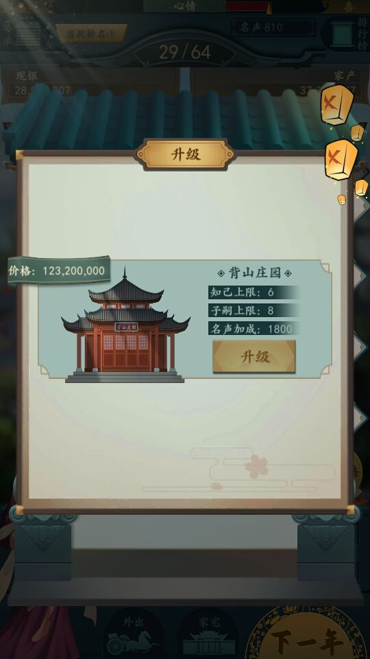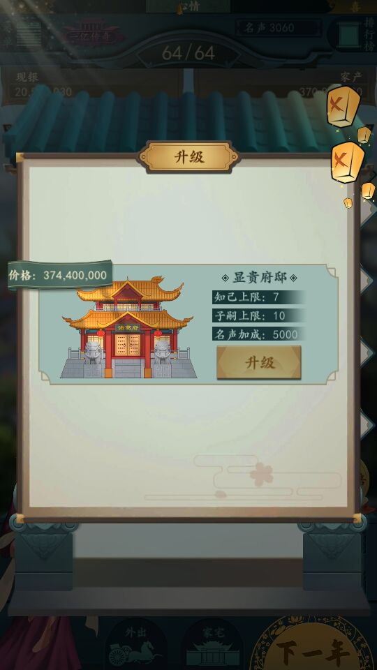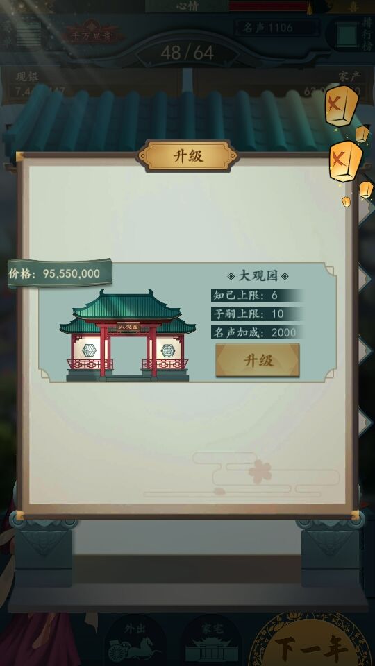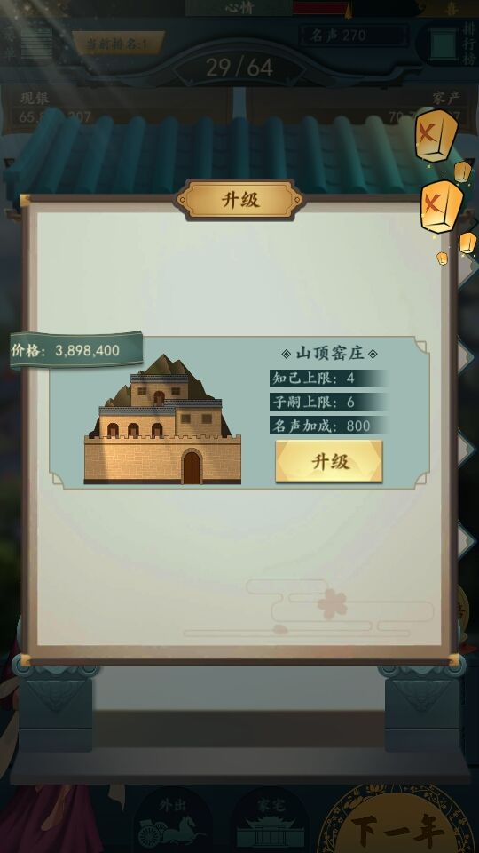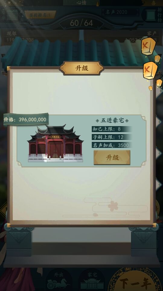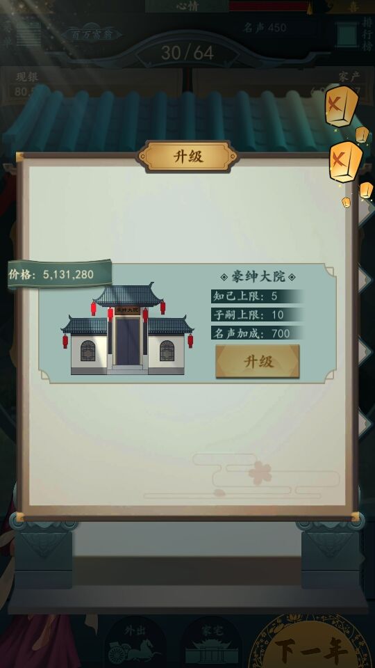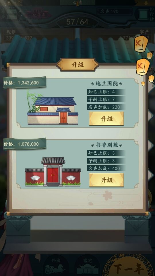 升级走瓦屋-地主围院-豪绅大院-大观园-显贵府邸。
