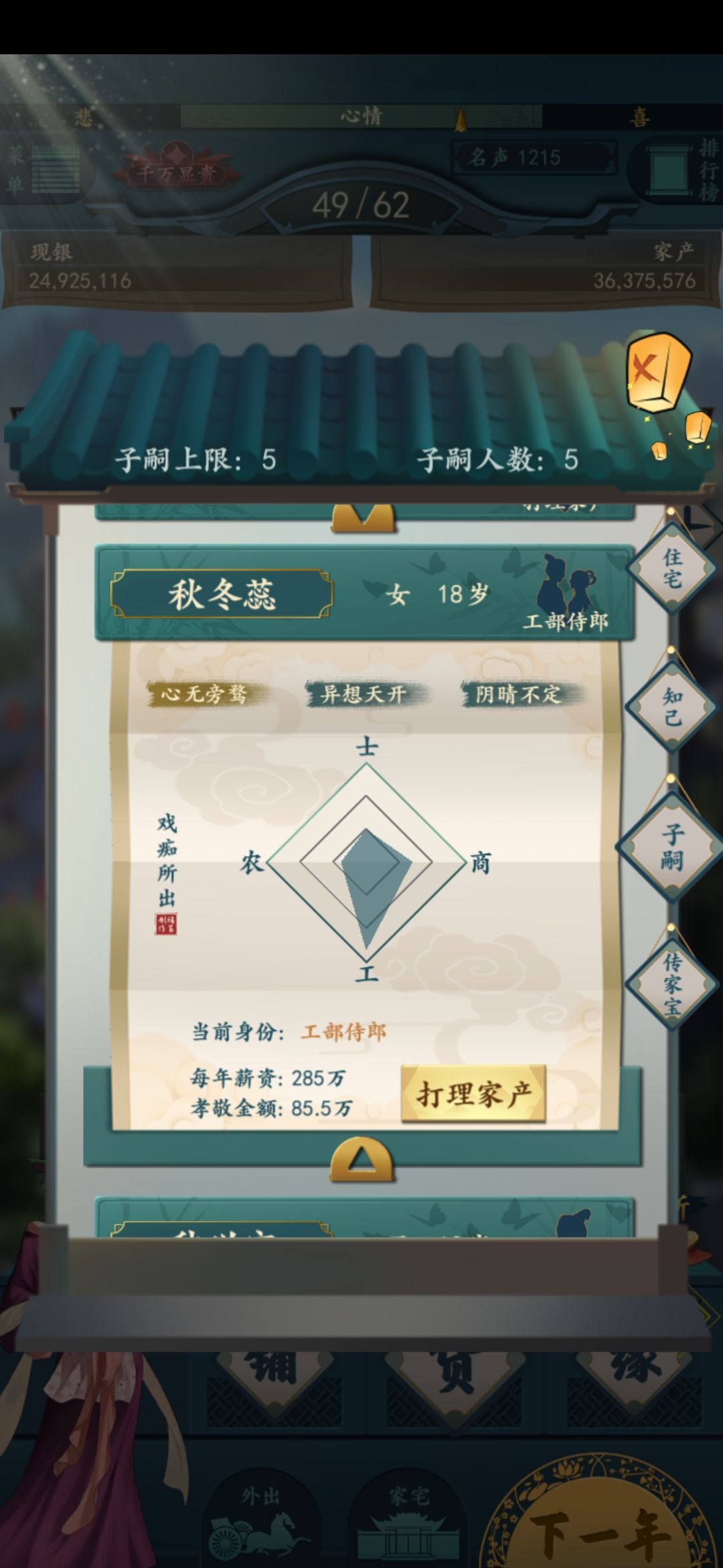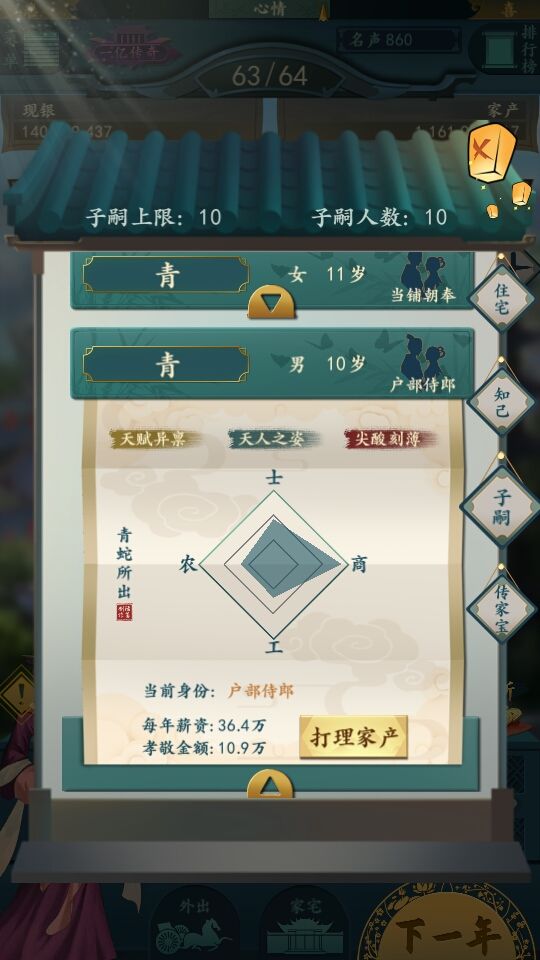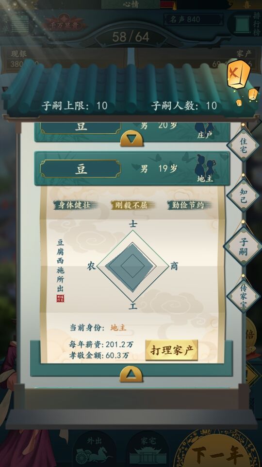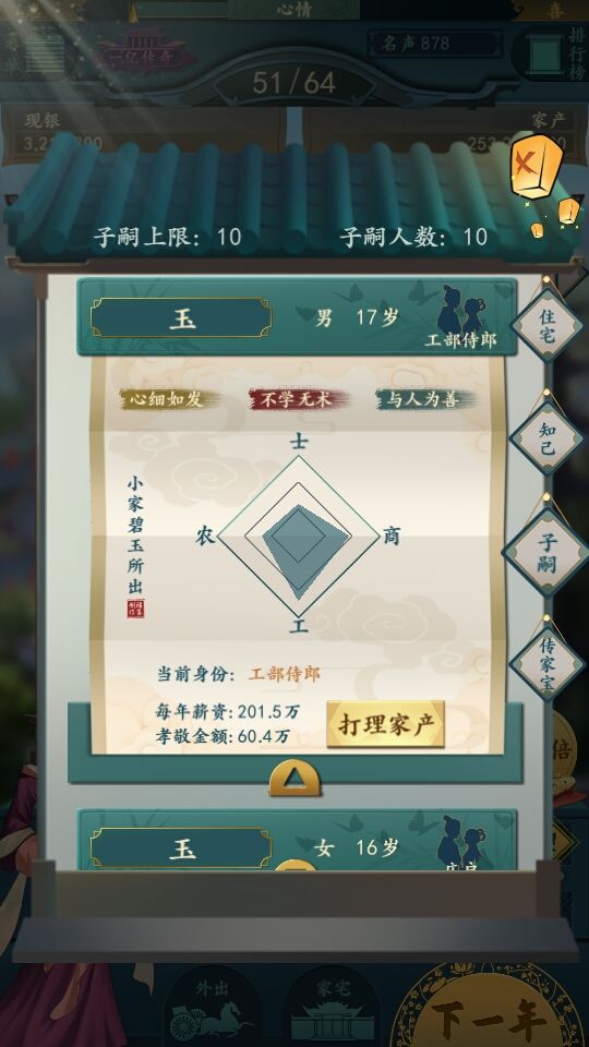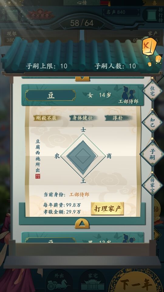 自立门户:除了士是每年给声望以外其他三属性都是每年孝敬你的。
