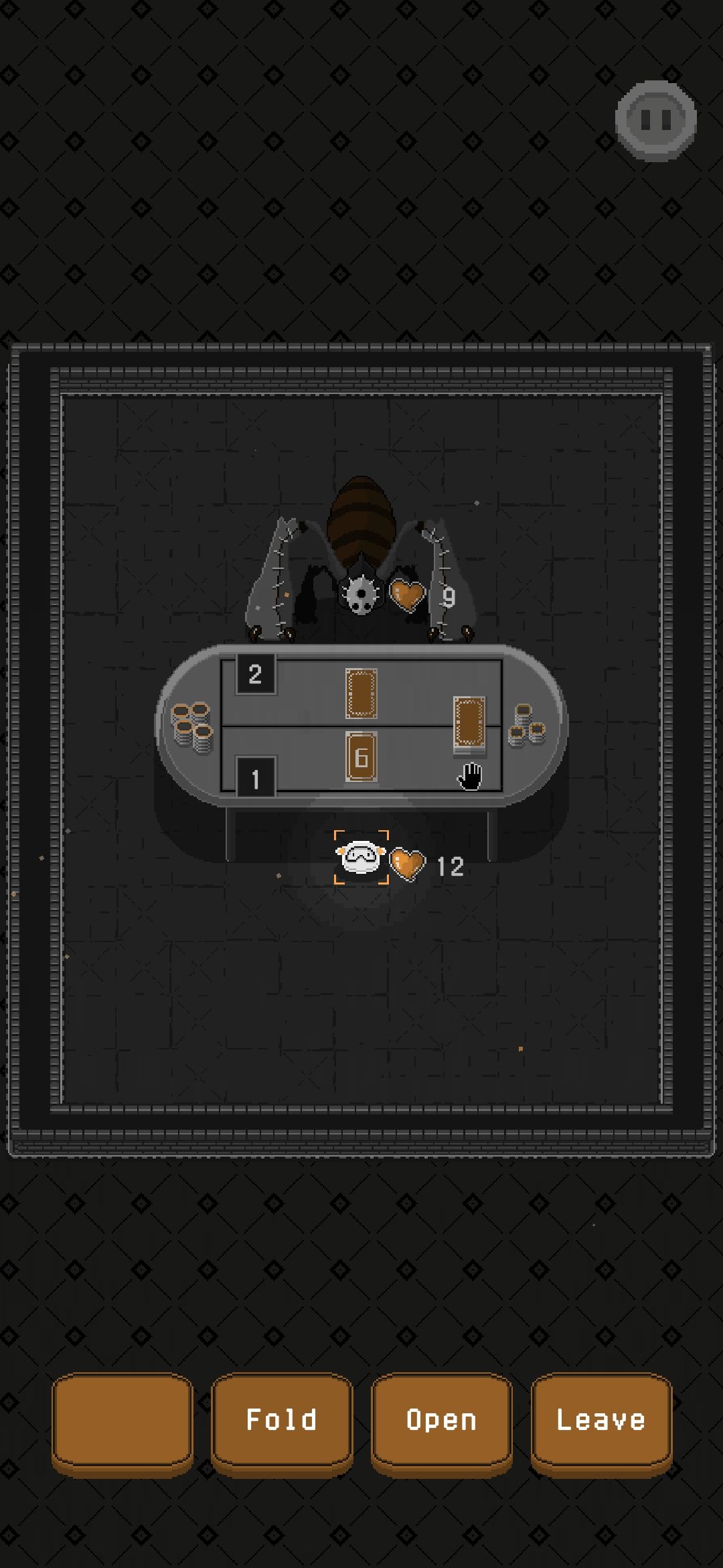 2.接下来是赌局规则:比大小。每一轮由玩家和它交替先手,先手的一方可以选择fold(弃牌输掉一个筹码)或者增加筹码到n个(先+1几下再in),如果先手一方选择增加筹码,后手一方可以fold(弃牌输一个)或者开牌(open,比大小,赢家拿走输家n个筹码)。一个筹码是五个钻石或者一点血,不会出现同样的牌。