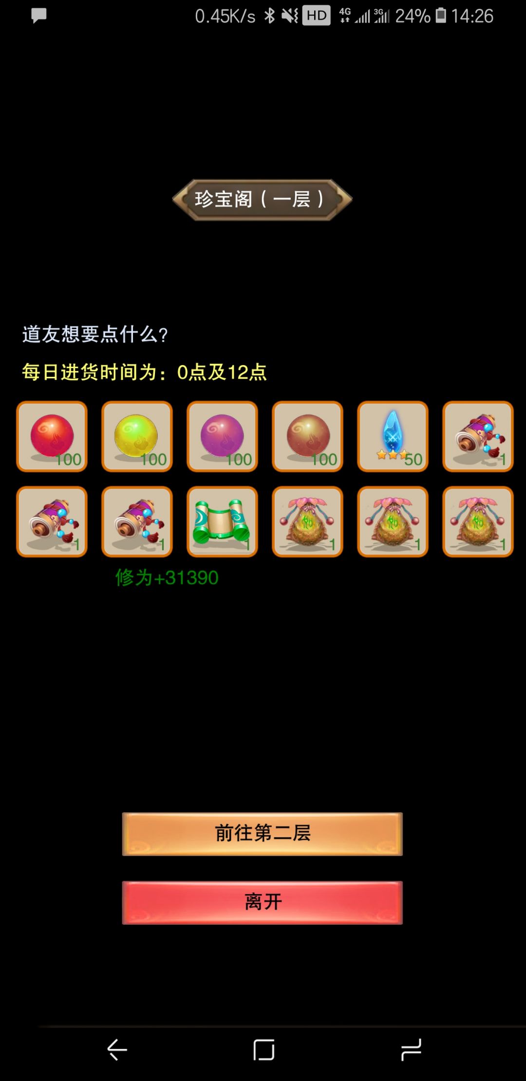 第二天起床应该可以连升几级,我在第二天上午11点左右的时候是元婴9。所以没能在12点前出窍,多刷一次商店。如果你完全按照我上面说的做,74聚灵的,在运气好的情况下可能可以在12点前出窍,139聚灵的应该就能比我多刷一次商店了。