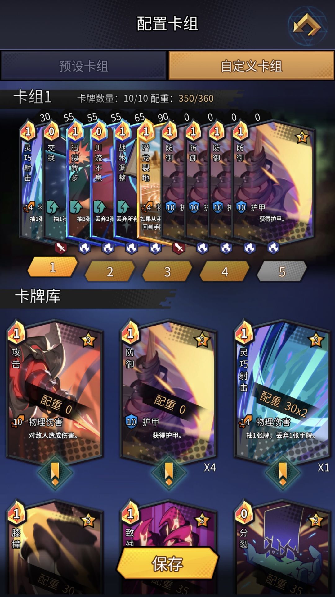 3🌟迪恩,无免疫枷锁,打得太累不想打了。萌新可以看看。这个打法打通是不可能的,潜龙就算5🌟每次也才叠28,就算免疫枷锁加一回合上限40张牌最多也只能叠1000多。初始配卡如图。进去拿交换,灵巧,战术调整。配合迪恩丢卡加甲的机制,前6关问题不大。顺便求大佬通关攻略。