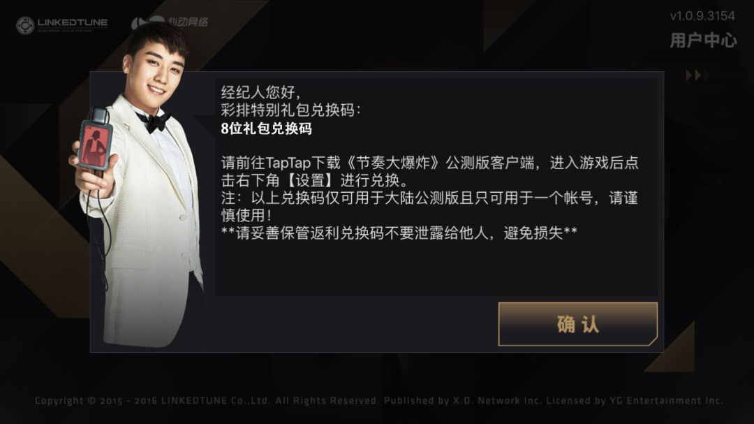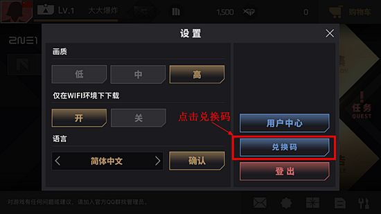 第三步:登录《节奏大爆炸》公测版客户端,点击“设置”→点击“兑换码”输入兑换码→“确认”