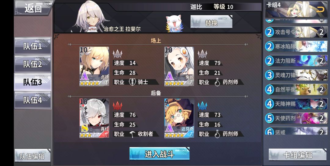 另外三个人,贞德、兔妮、达芬奇,无需满星无需觉醒,强化高一点别被秒就好了。因为这层不能用圣盾和不灭苟,所以我们带上各种苟药,兔妮贞德在前,达芬奇待命,上吧。