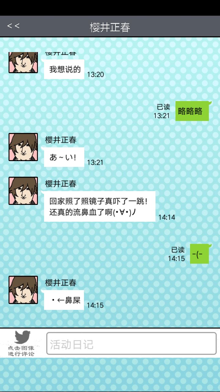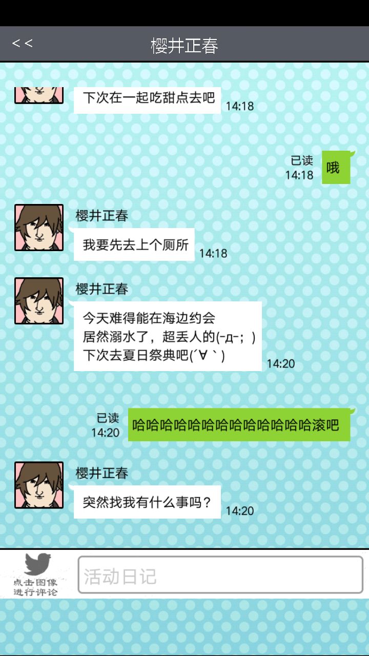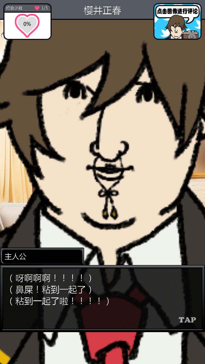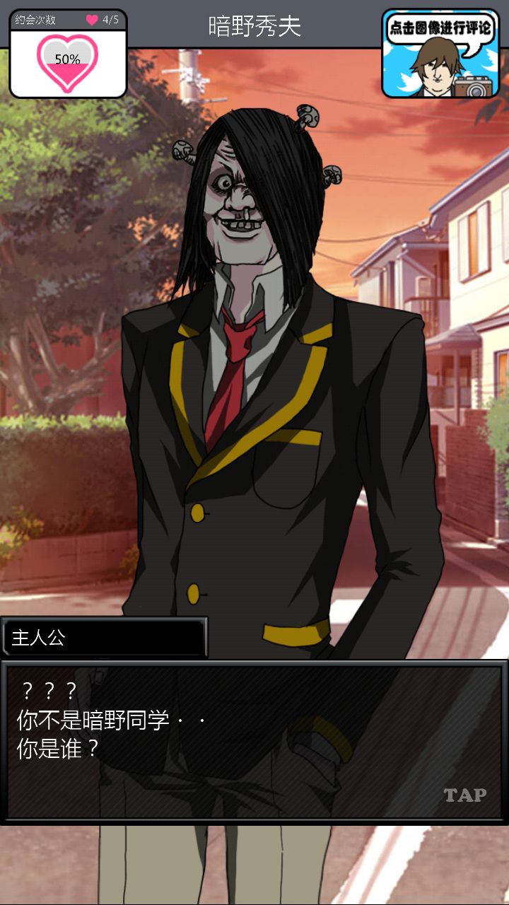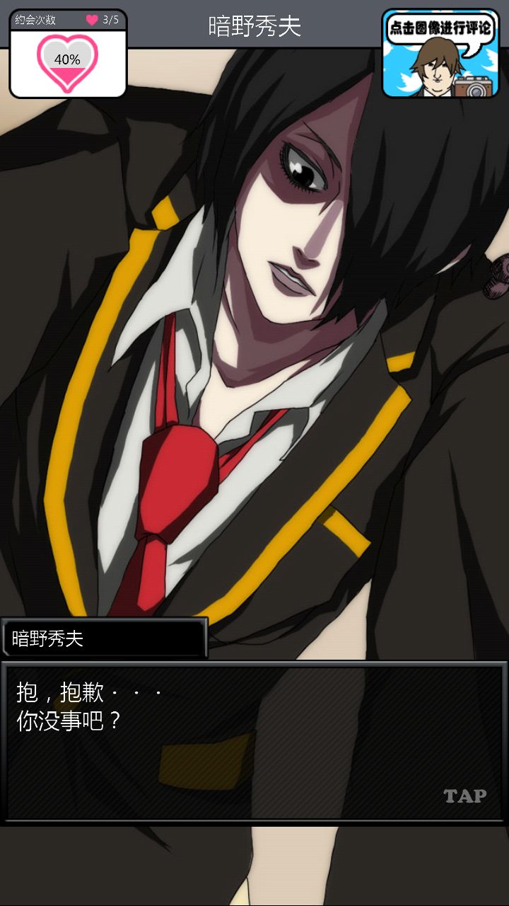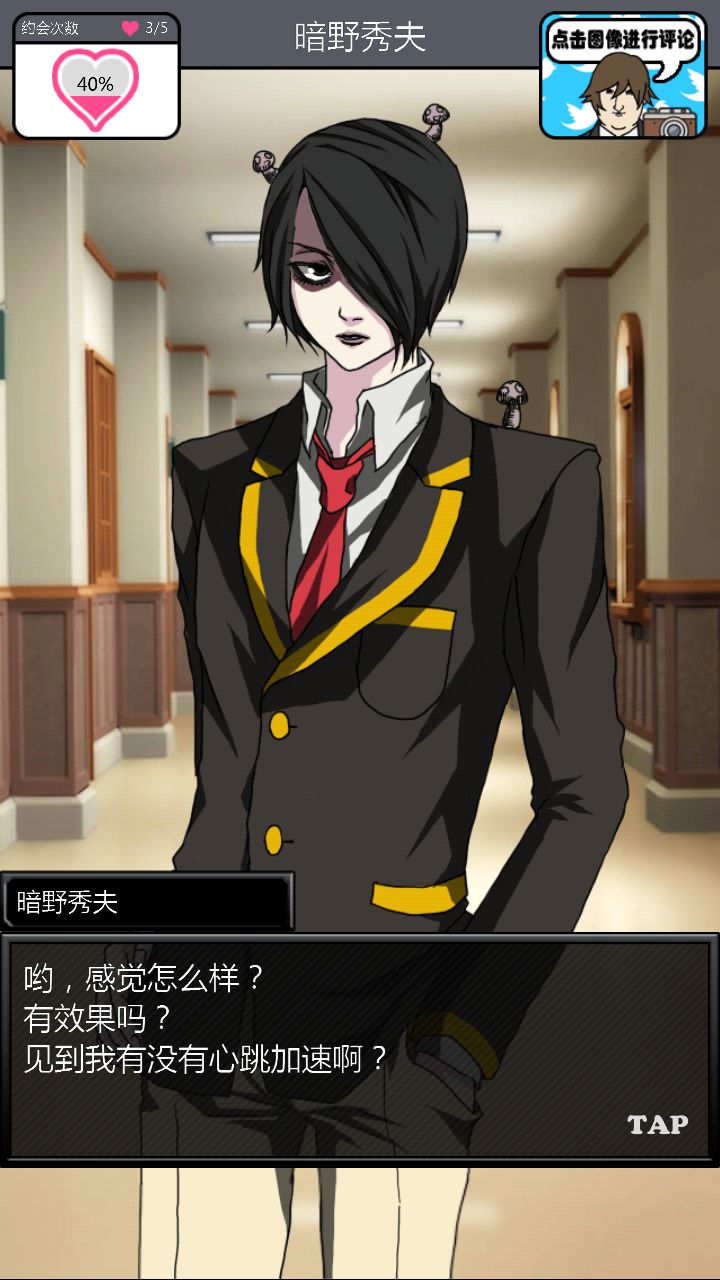 第二个对象是这位大佬。。。。。对不起你的BGM这么那么。。。。阴森。与他第一次约会的时候强!烈!建!议!把!音!量!关!掉!神他妈第一次约会给你讲鬼故事!那个滋滋滋的音乐怎么做的这么应景!再加上他的脸色我以为下一秒会有东西从屏幕里出现使我的手机砸到地板上碎成渣渣,所以果断转过手机屏幕一顿胡点,然后。。。。嗯。。。壁咚啊。。。真的是壁咚啊。。。呵。呵。呵呵呵【从那时开始心情就有些。。。奇怪】