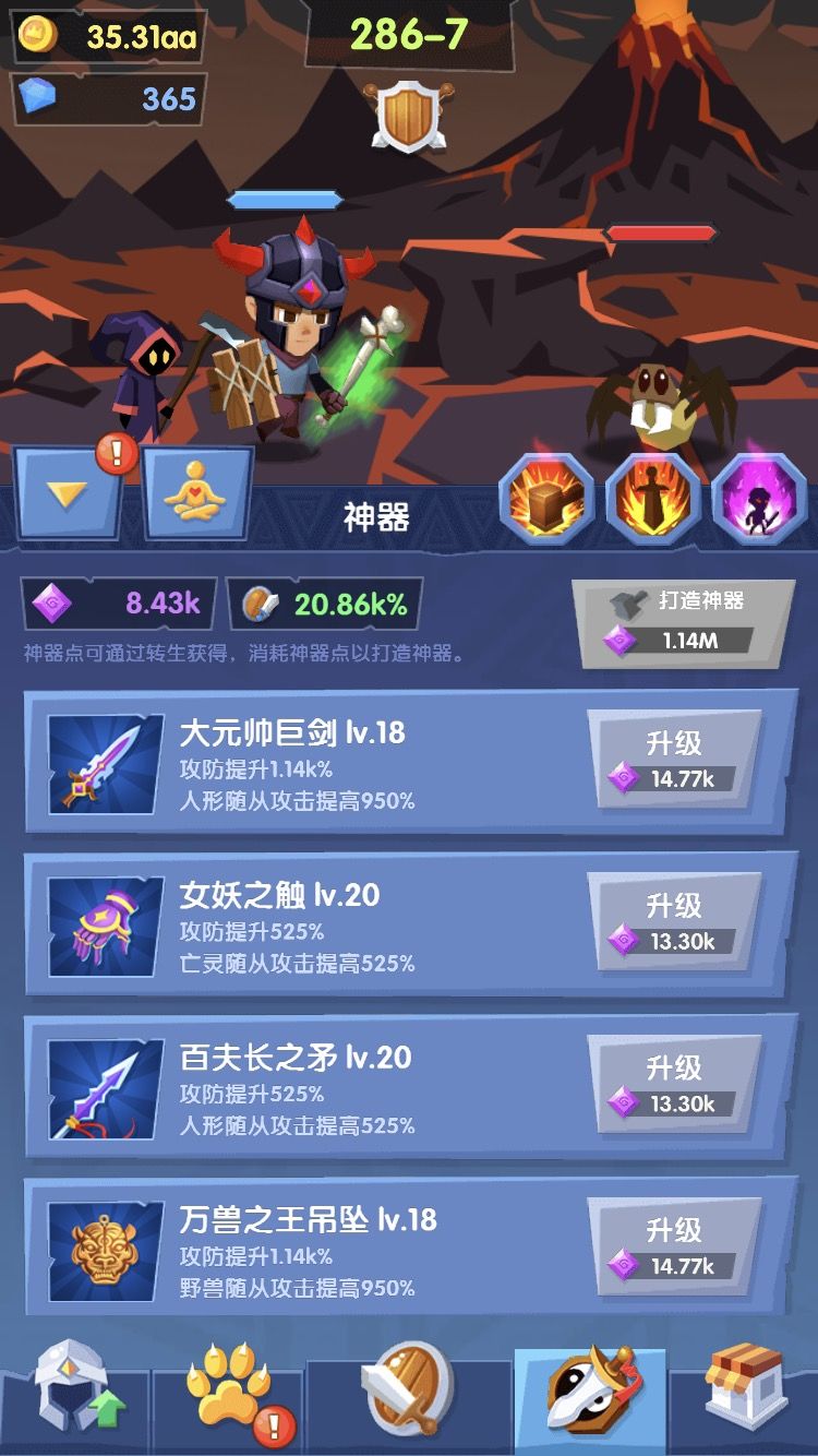 第五,神器方面,我现在觉得重要是两个神器点加成,一个金币加成,狂暴有增加时间,还没有出减cd,我还没有减小关数的神器,不知道这游戏会有