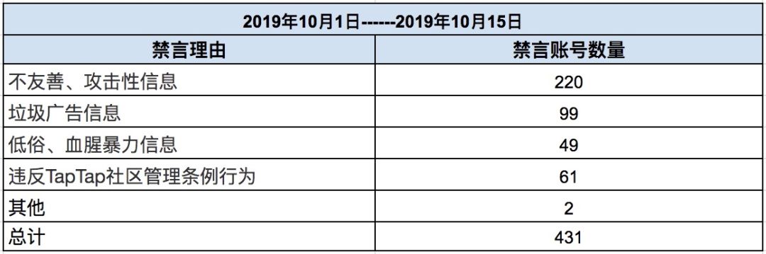 九月上半月禁封账号总量为1482,相较于上期总量大幅减少,在没有了水军骚扰的十月上半月,TapTap整体内容保持了更高的真实性与客观性。