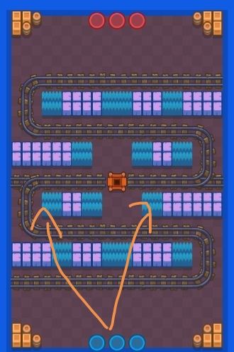 游戏开始了,吉恩可前往左右箭头所指的位置,但我不推荐吉恩抢宝石 因为吉恩的血量不高逃走的几率也很小,就在边路默默的消耗敌人就行了。 尽可能发挥 自身的优势 ,既然可以用分散的火焰去找出敌人的位置,让队友更好的躲避或者攻击对手,以上地图最好是用卡尔潘尼,或者迪克,在进攻和防守方面比较良好,配上第一星辉,让队友能快速投入战斗,在宝石地图中大招如果运用良好拉过来宝石多的英雄,可合力击败,大招一定要瞄准了放,不要让系统判定,不然会出错的。这地图会有矿车从地图左右洞口出来,一定要小心躲避,不小心撞抓到了就惨了,他会对你造成2000点伤害,小心对手趁人之危哦,你也可以利用对手躲避矿车的时间拿宝石,对手也就只能看着你来回走动了。