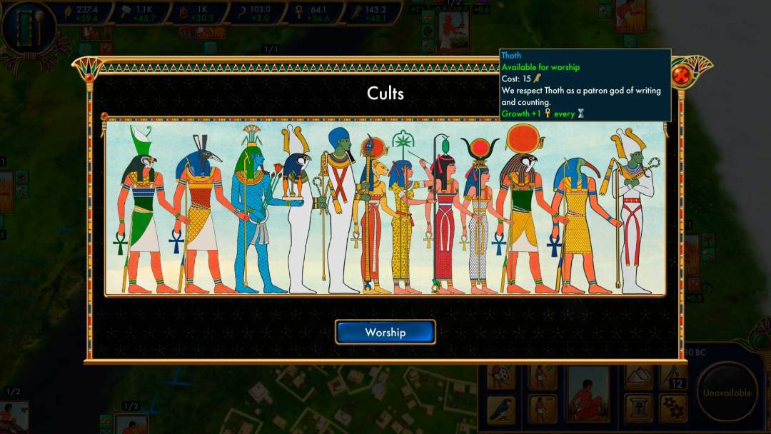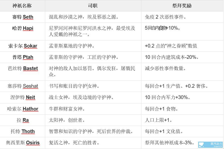 在《埃及古国》中,我们提供了全新的教派菜单,共12位埃及神只:荷鲁斯Horus、赛特Seth、哈碧Hapi、索卡尔Sokar、普塔Ptah、芭丝特Bastet、塞莎特Seshat、涅伊特Neith、哈索尔Hathor、拉Ra、托特Thoth、奥西里斯Osiris(详见下图),分成了数量相等的两组:祭拜第一组神只会给玩家带来短期的快速奖励,祭拜第二组神只会给玩家带来各项数值的稳定增长。游戏开局时,只允许祭拜3位神只:荷鲁斯Horus、赛特Seth、哈碧Hapi,其它神只会陆续登场,比如探索了新技术或经历了特定历史事件等等。