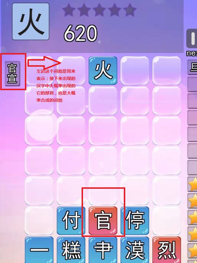 左边的官宣是用来提示玩家:接下来掉落的汉字里,大概率出现官宣里字的部首(宀㠯,宀一旦),围绕这个来玩,就会容易很多的。