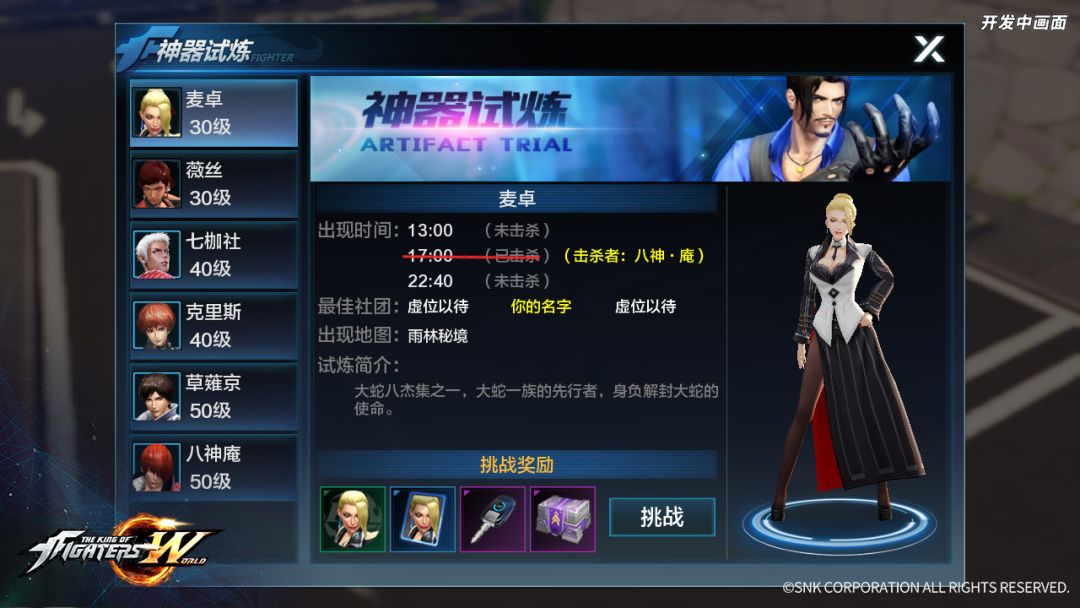 在《拳皇世界》中,当玩家等级达到30级并加入社团,在活动开启的三个时间段:13:00、17:00、22:40即可通过活动界面进入神器试炼,试炼时长为1个小时。