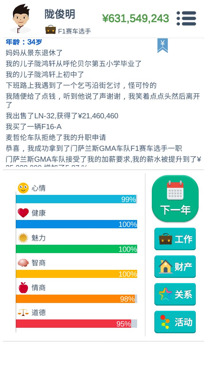 然后把财产留给孩子。成为孩子之后,考驾照,买赛车,等到20岁,就可以成为初级方程式赛车选手,错过这年龄就永远成为不了赛车手。26岁时,可以成为F3赛车手,29岁F2,34岁F1。