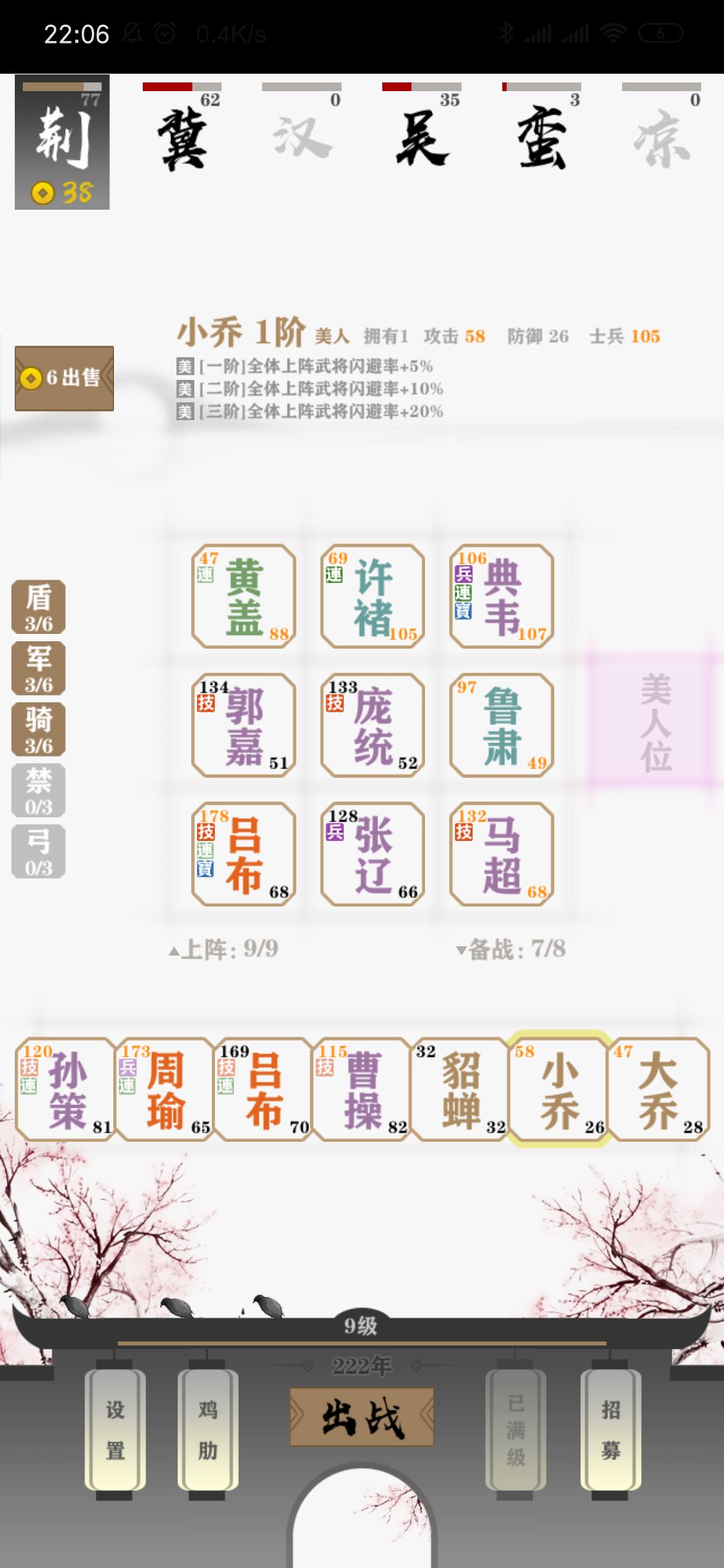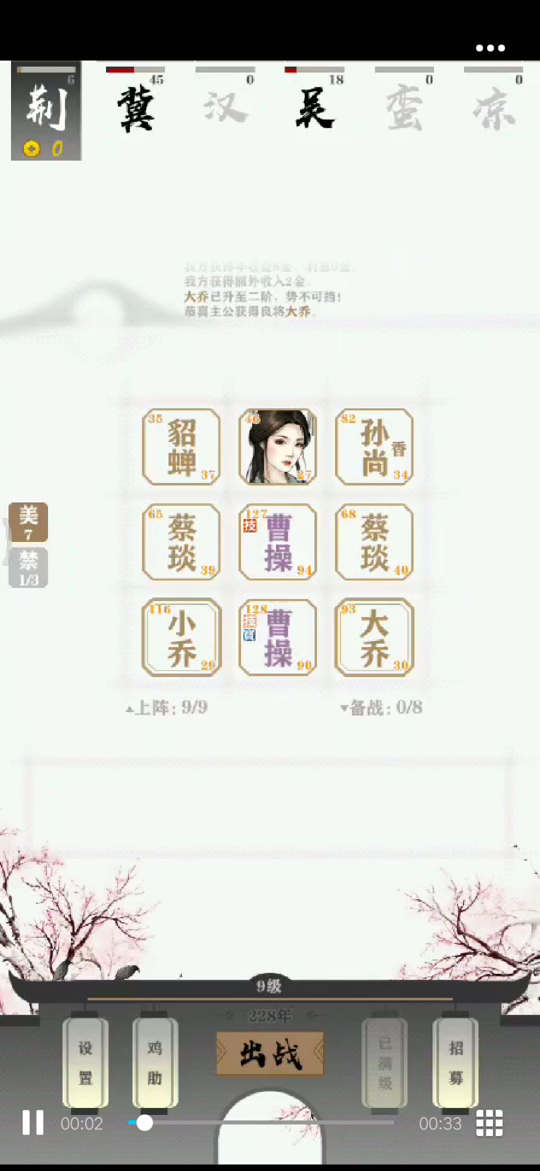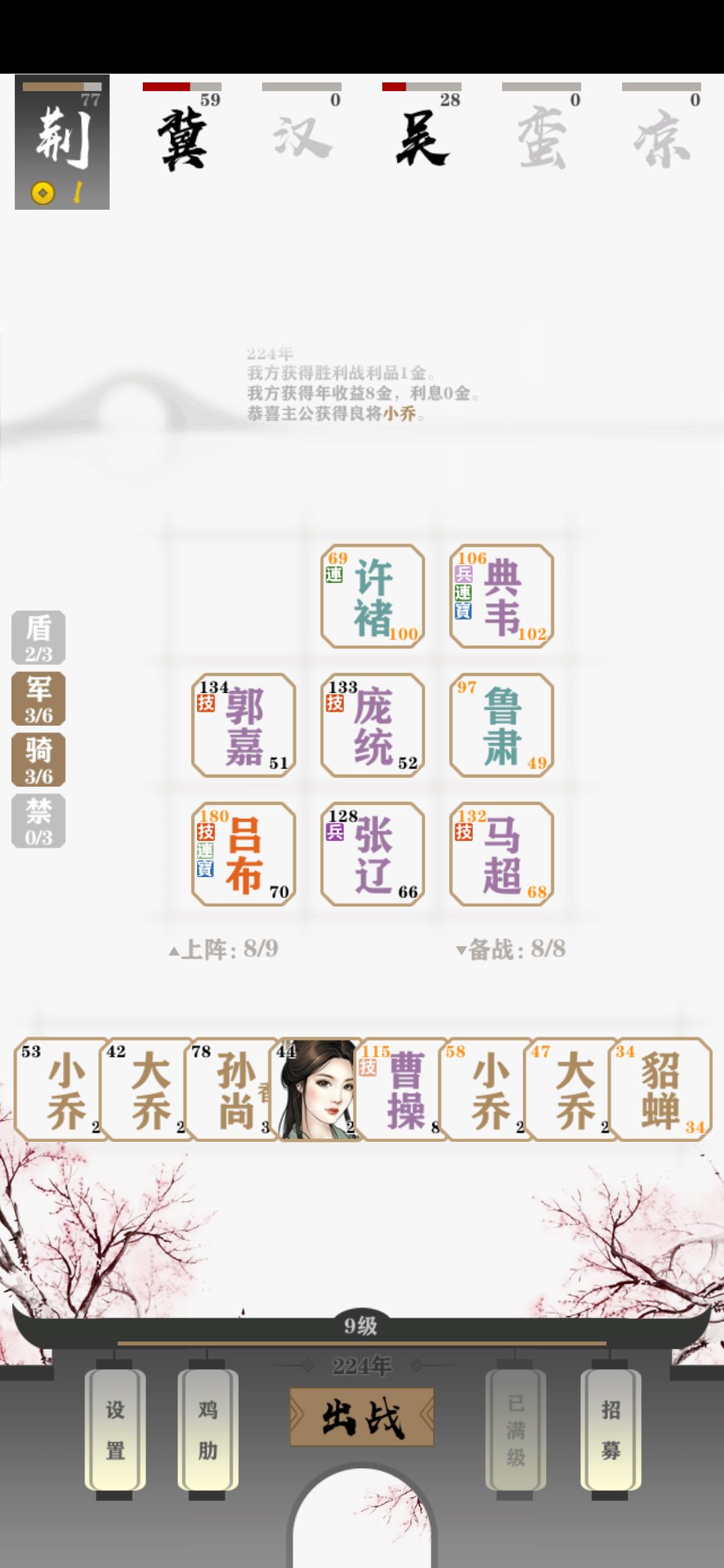 材料:荆州,萌新难度,所有武将不升装备不买,美人尽量白嫖,优先民心100。