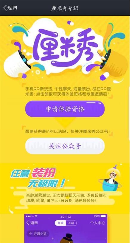 在手机QQ中,选择“联系人”页面,在顶端“搜索框”输入“厘米秀”,在出现的搜索选项中,选择“功能-厘米秀”“申请体验资格”