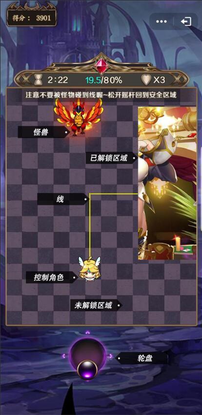 每局游戏限时3分钟,游戏过程中需注意不要被“怪兽”碰撞到“控制角色”或“线”,每被碰撞一次则扣除一点“挑战机会”