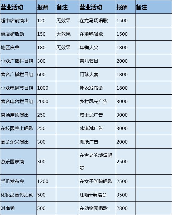 以上就是全部的营业活动啦,注意最开始三种营业活动只会影响酬金,其余所有活动还会影响粉丝数量,尤其打上特殊备注的三个,如果不是很缺钱,千万不要去做哦!