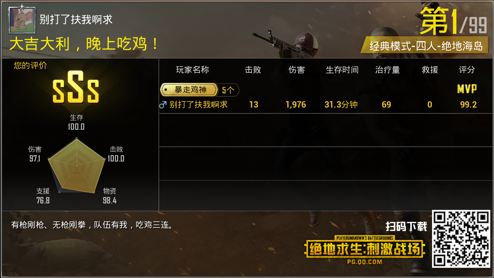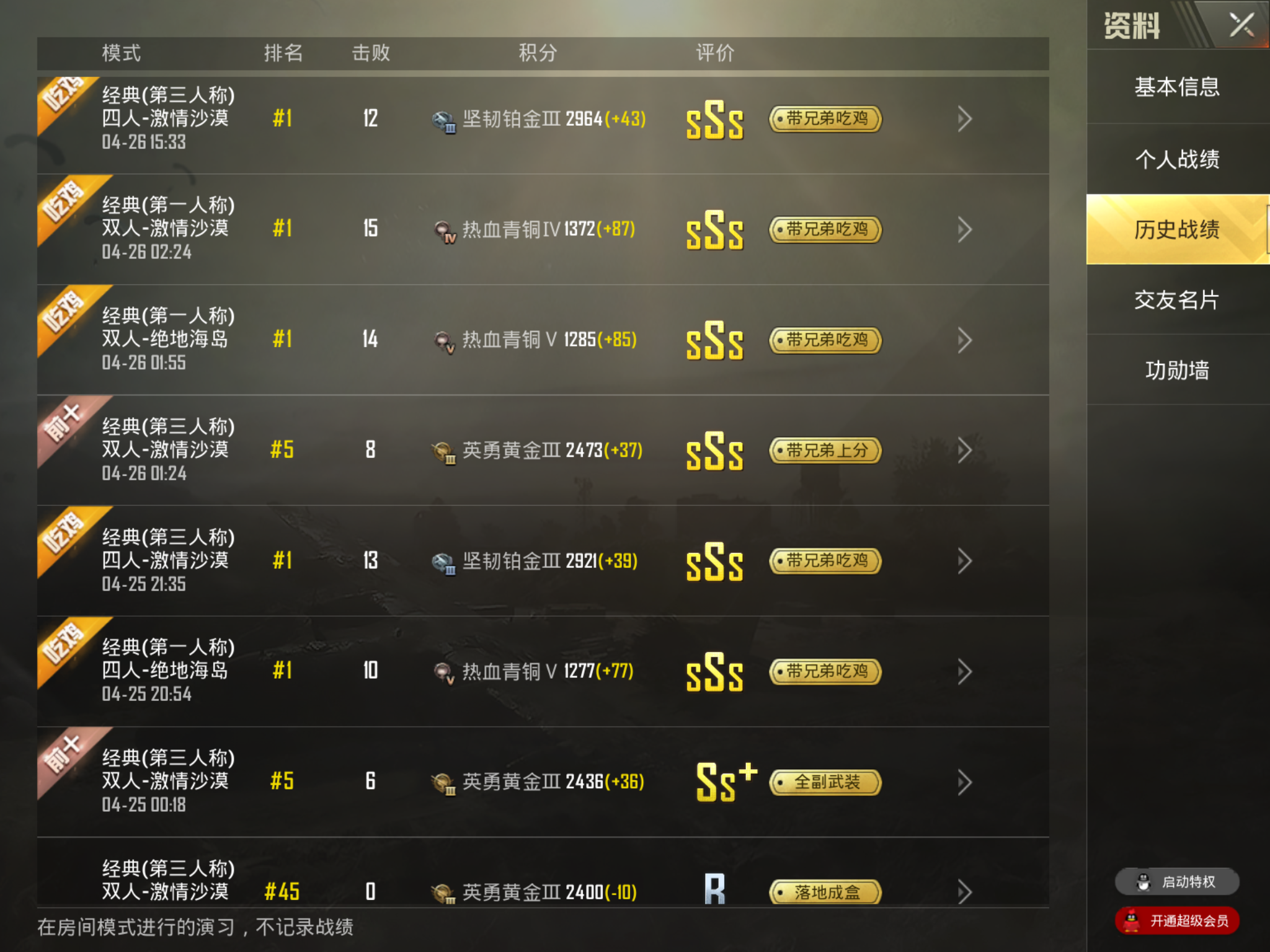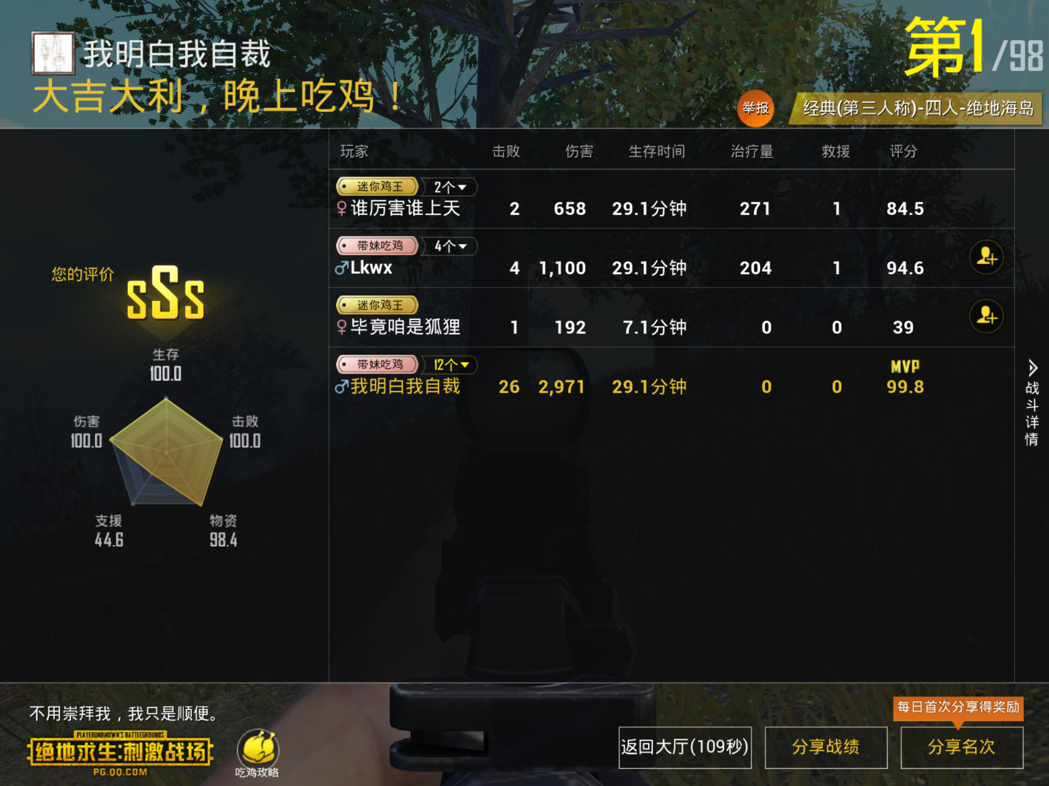 放几张图吧先,四排最高一场26击杀,好像是星钻4还是5的局,单人四排也吃过鸡,这游戏有时候真的要靠点点运气哈哈哈