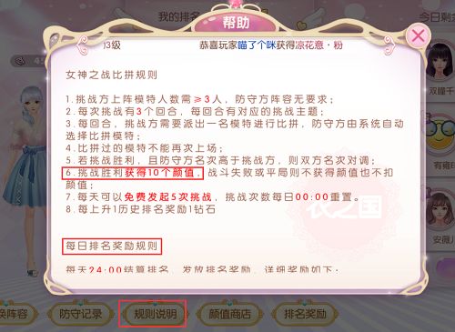 1.颜值 颜值的获取方式是通过女神战来获得,其中也包括了两种方式。一种是挑战其他玩家胜利就会获得10个颜值,失败也不会扣除。第二种方式就是按照女神战的排名,每天24:00结算排名发放奖励(女神战的规则说明里面有详细的奖励说明),会发到你的邮箱直接领取就可以了。