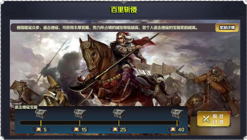 只有玩家所述的势力占领了城池之后,每天的21:00到第二天的19:00才可以进行百里斩倭的玩法,百里斩倭的怪物难度是根据挑战玩家的等级自动生成的。进入根据击杀敌军数量,可以领取不同档位的宝箱。