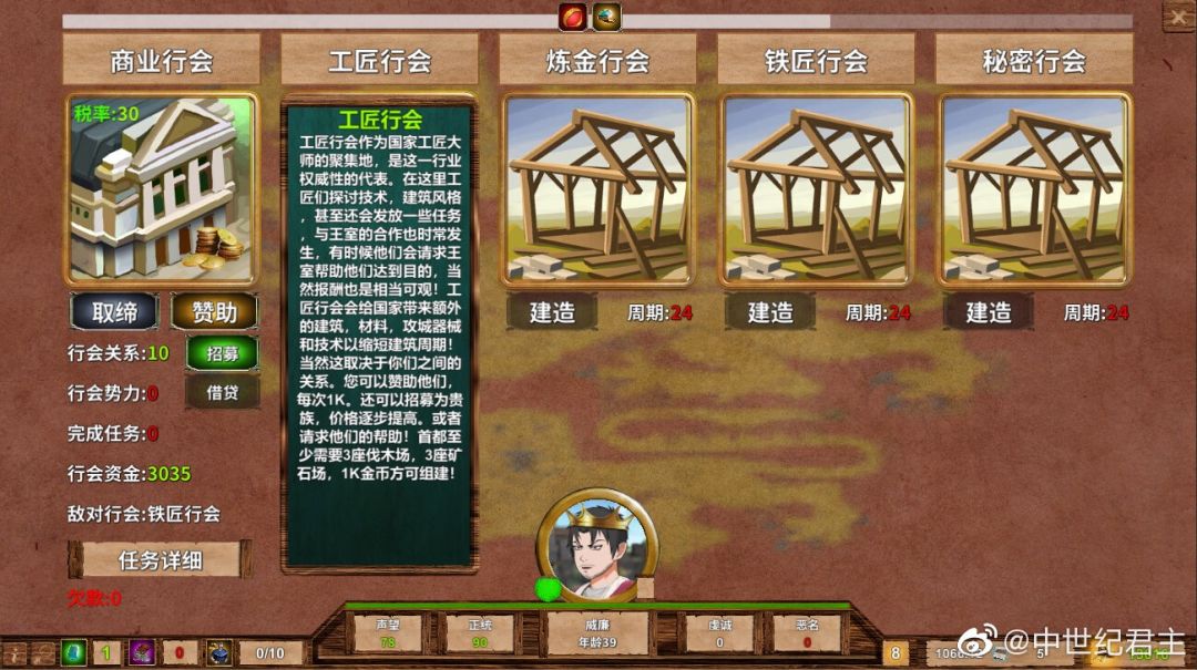 您可以建造想要组建的行会,并可以完成行会的任务领取酬金或者物资,也可以招募行会的人才,但是这会提高行会的势力,您还可以让行会帮助你做一些其他的事情,比如向商业行会借钱,工匠行会帮助您建造,秘密行会进行宗教审判等等,请注意,行会势力过大将导致他们的野心膨胀,可能会影响到您的政策。每个行会可能会出现一个敌对行会,这个竞争的敌对行会会随着时间动态的改变,当完成某个行会的任务时,敌对行会的好感和势力会降低,本行会会提高。行会都有建造的必要条件,商业行会的条件最低,我们就以商业行会进行举例: